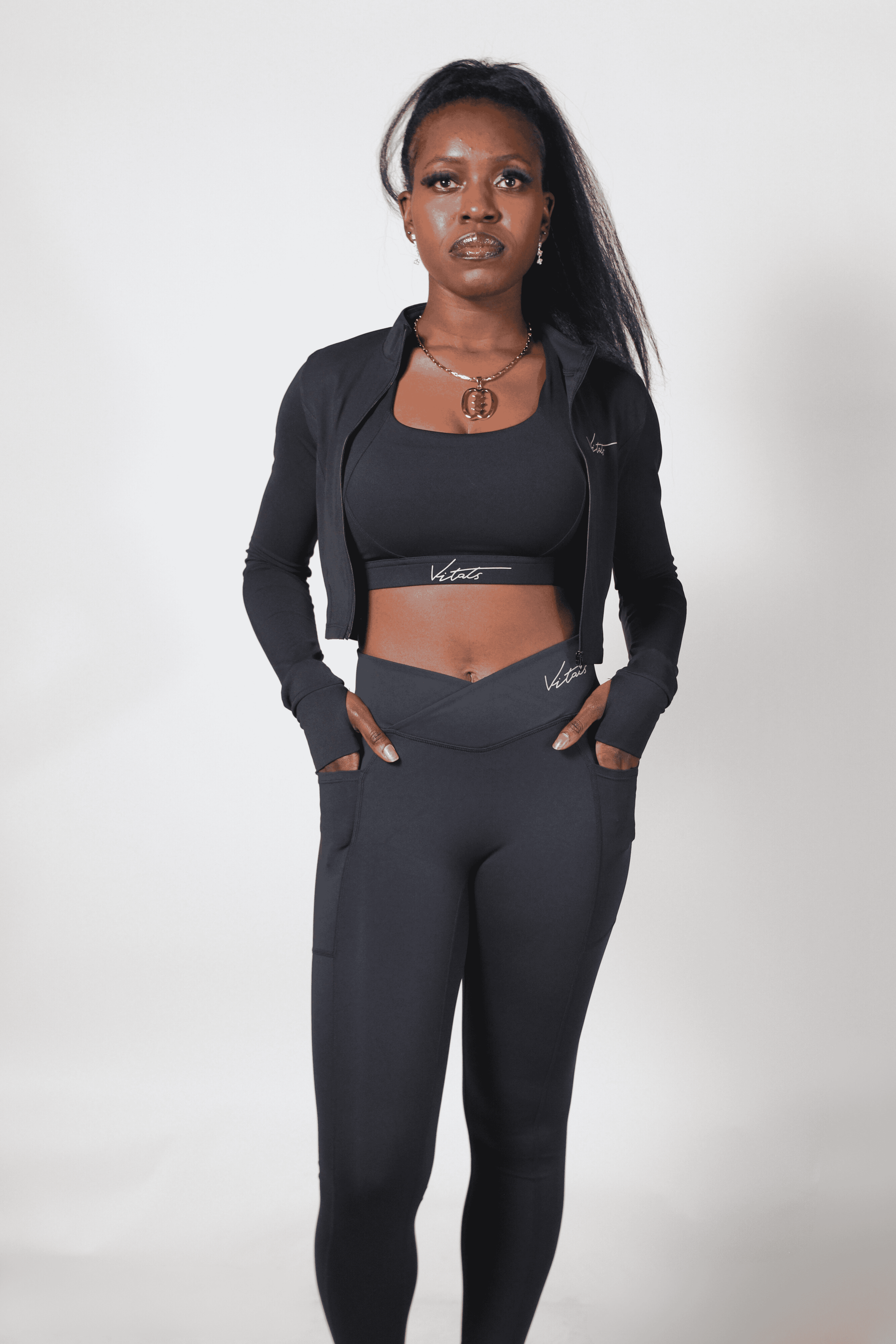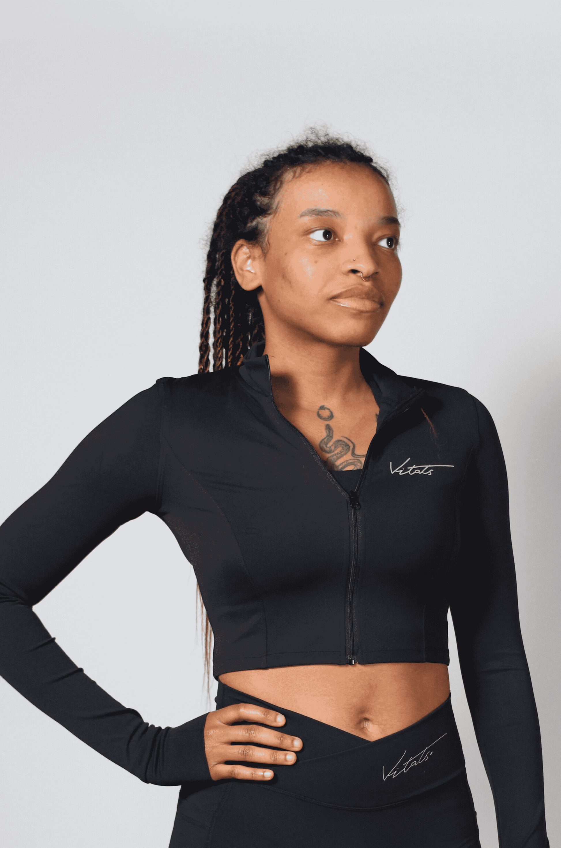 Introducing our Athletic Cropped Zip-Up Jacket, the ultimate blend of performance and style. Crafted from a premium fabric blend of 76% Nylon and 24% Spandex, this jacket offers a thick, buttery smooth feel that is both luxurious and functional.