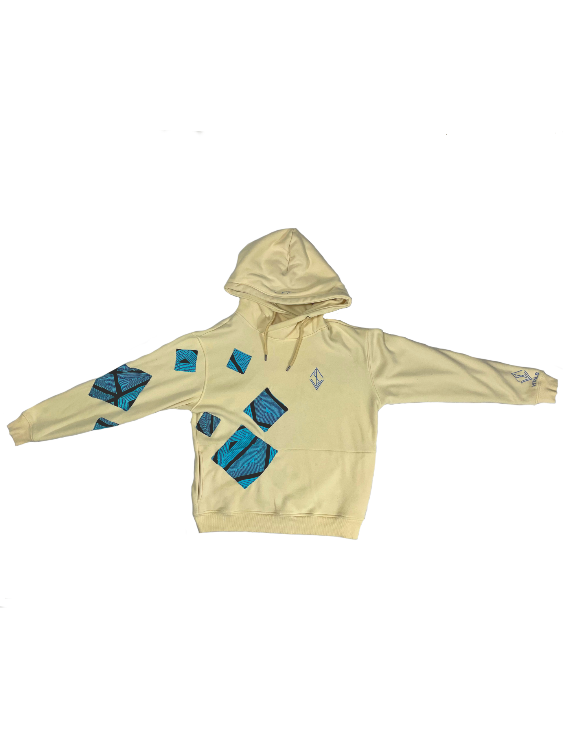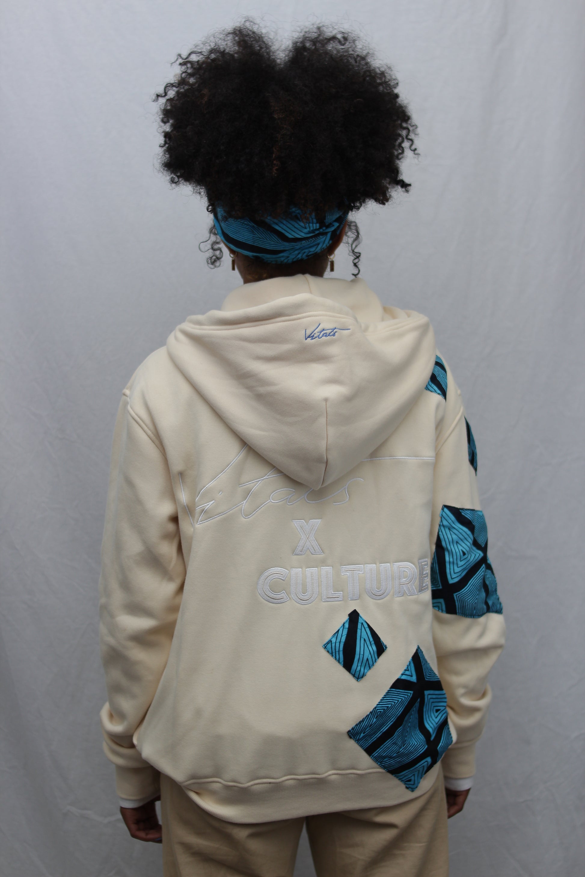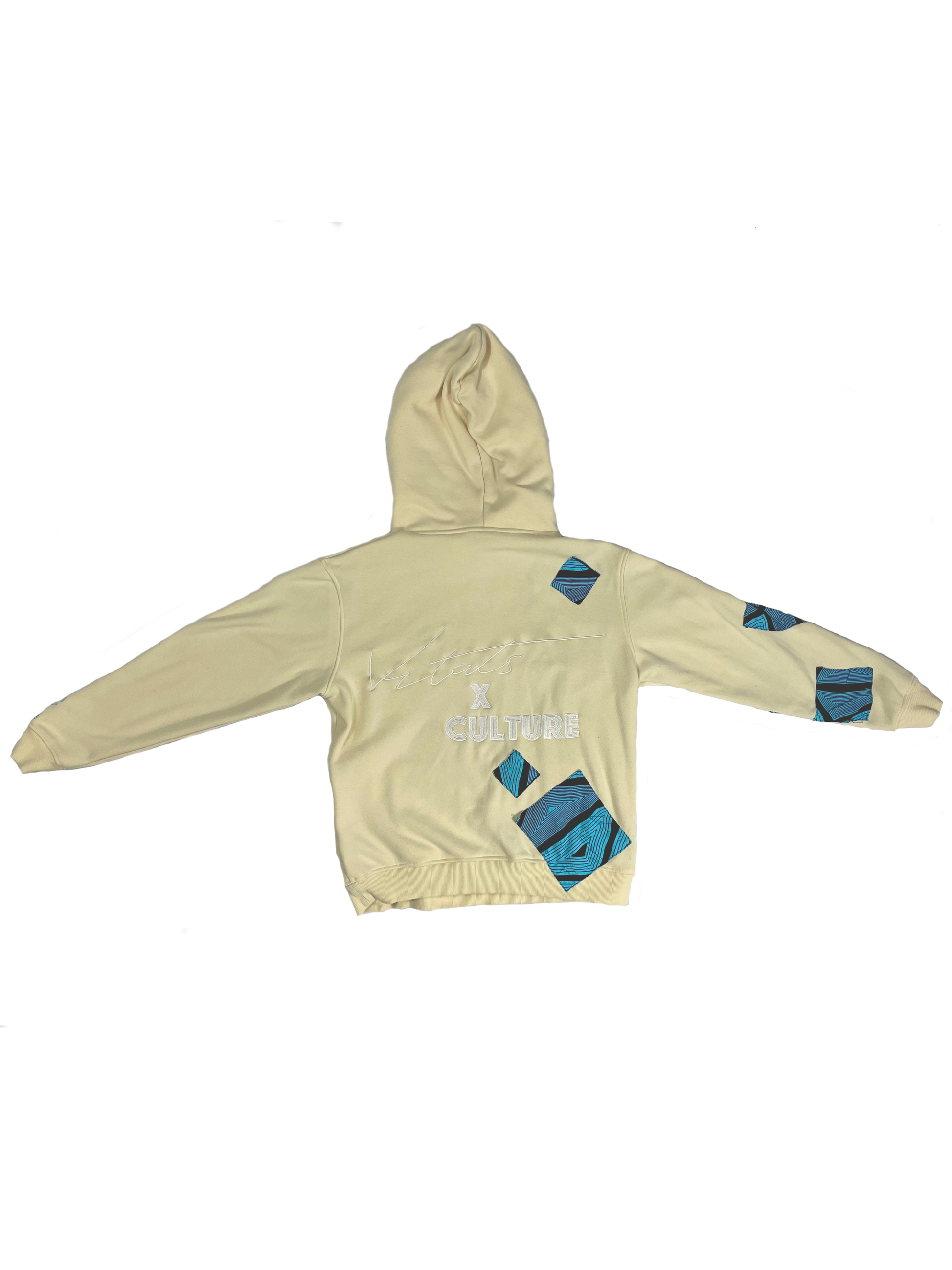 Introducing our Vitals x Culture Hoodie, a premium cream-colored hoodie hand-stitched with Ankara fabric by the designer of this masterpiece. This piece is a representation of the colors of the sky and beaches found where the designer grew up, with Ankara being a type of wax print fabric commonly used in African clothing.