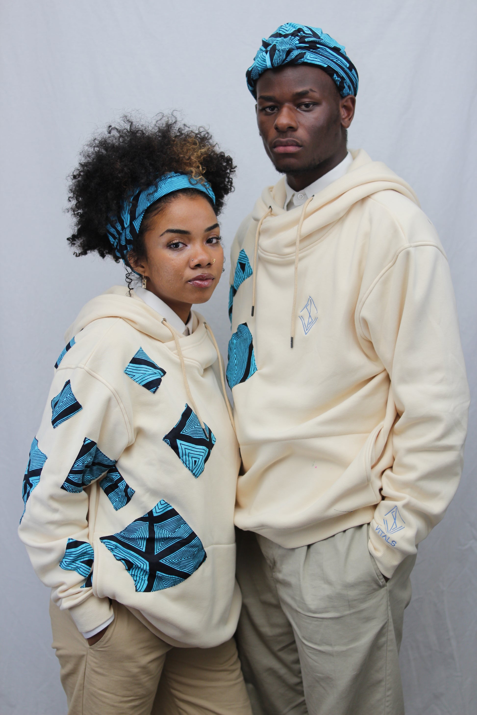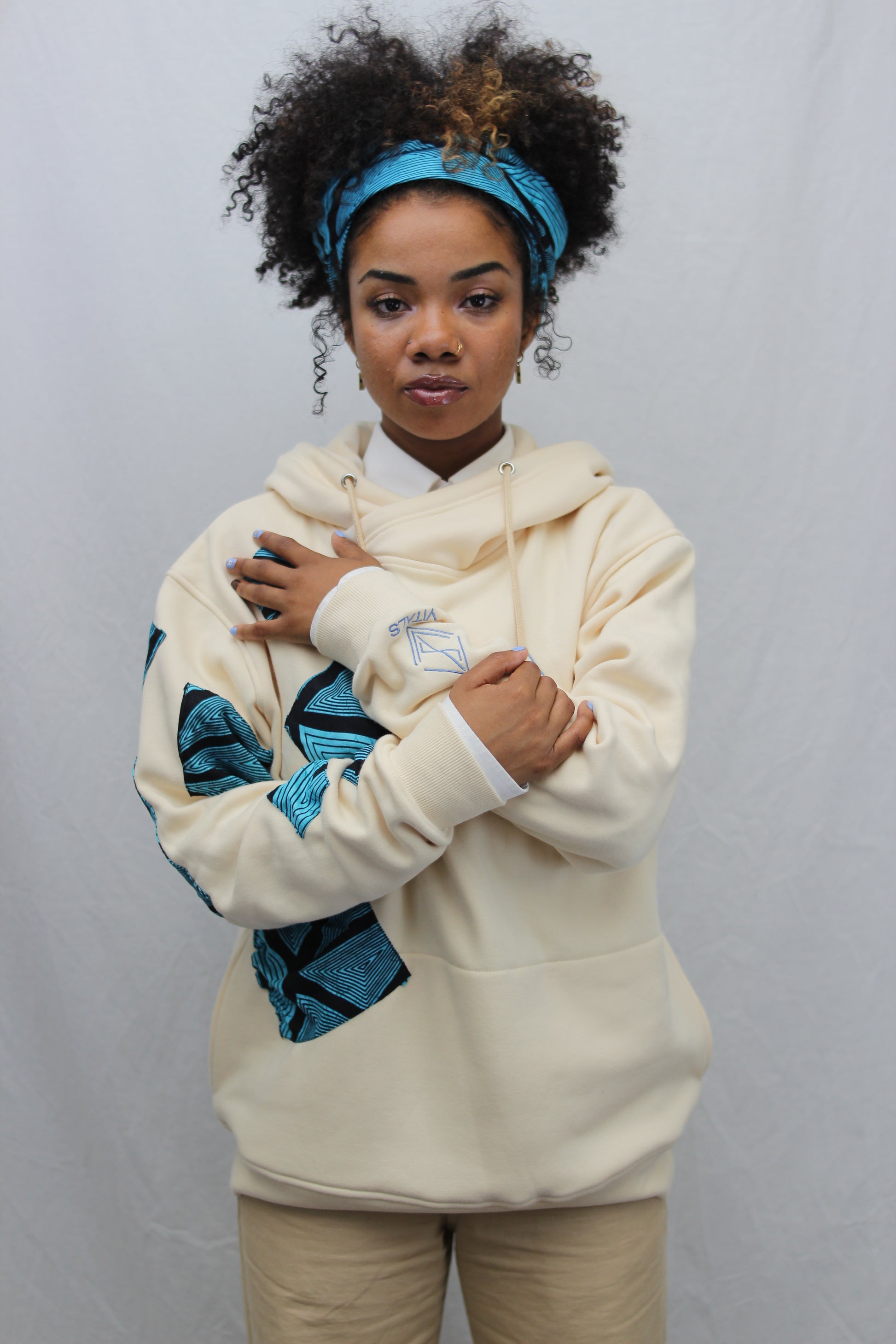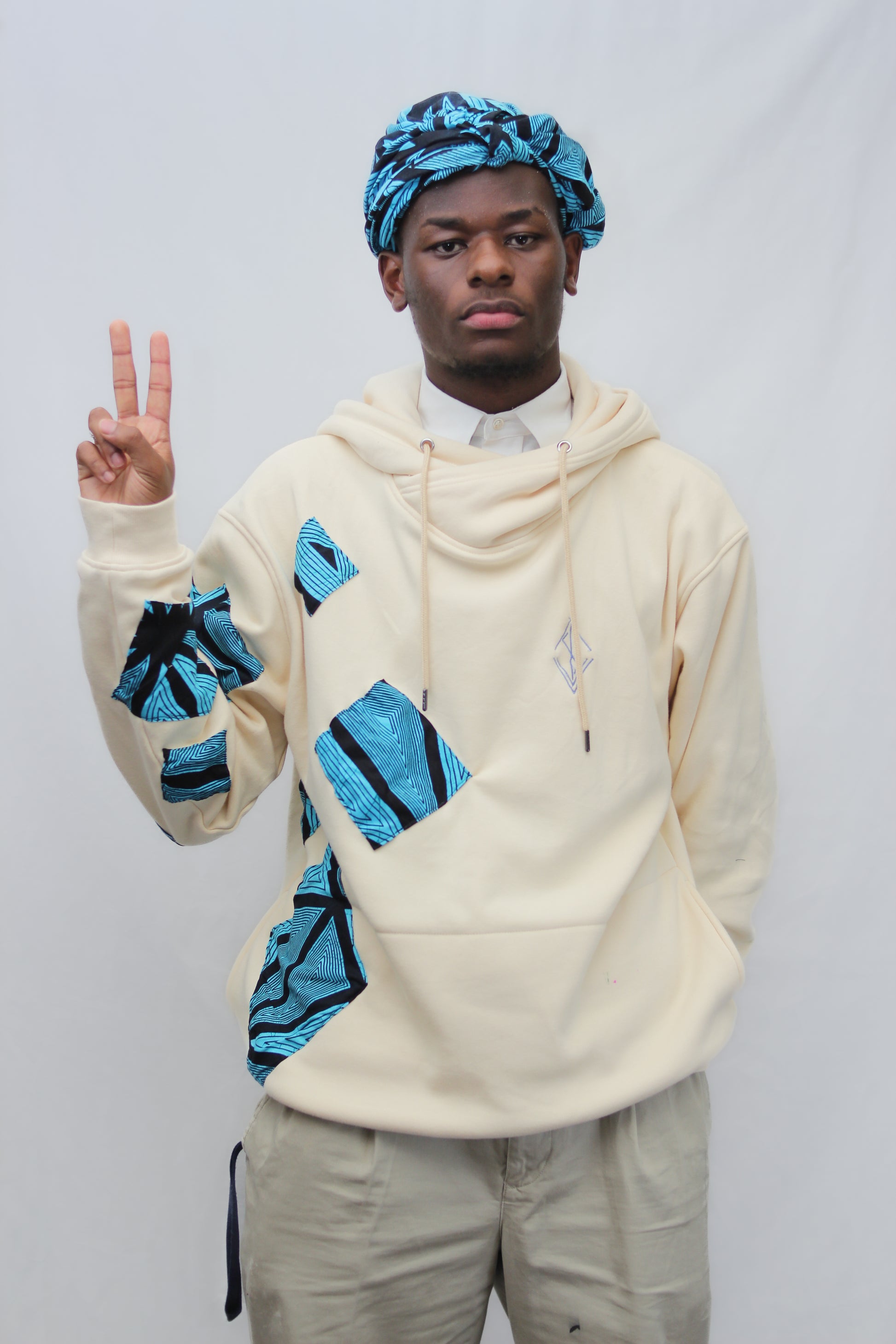 Introducing our Vitals x Culture Hoodie, a premium cream-colored hoodie hand-stitched with Ankara fabric by the designer of this masterpiece. This piece is a representation of the colors of the sky and beaches found where the designer grew up, with Ankara being a type of wax print fabric commonly used in African clothing.