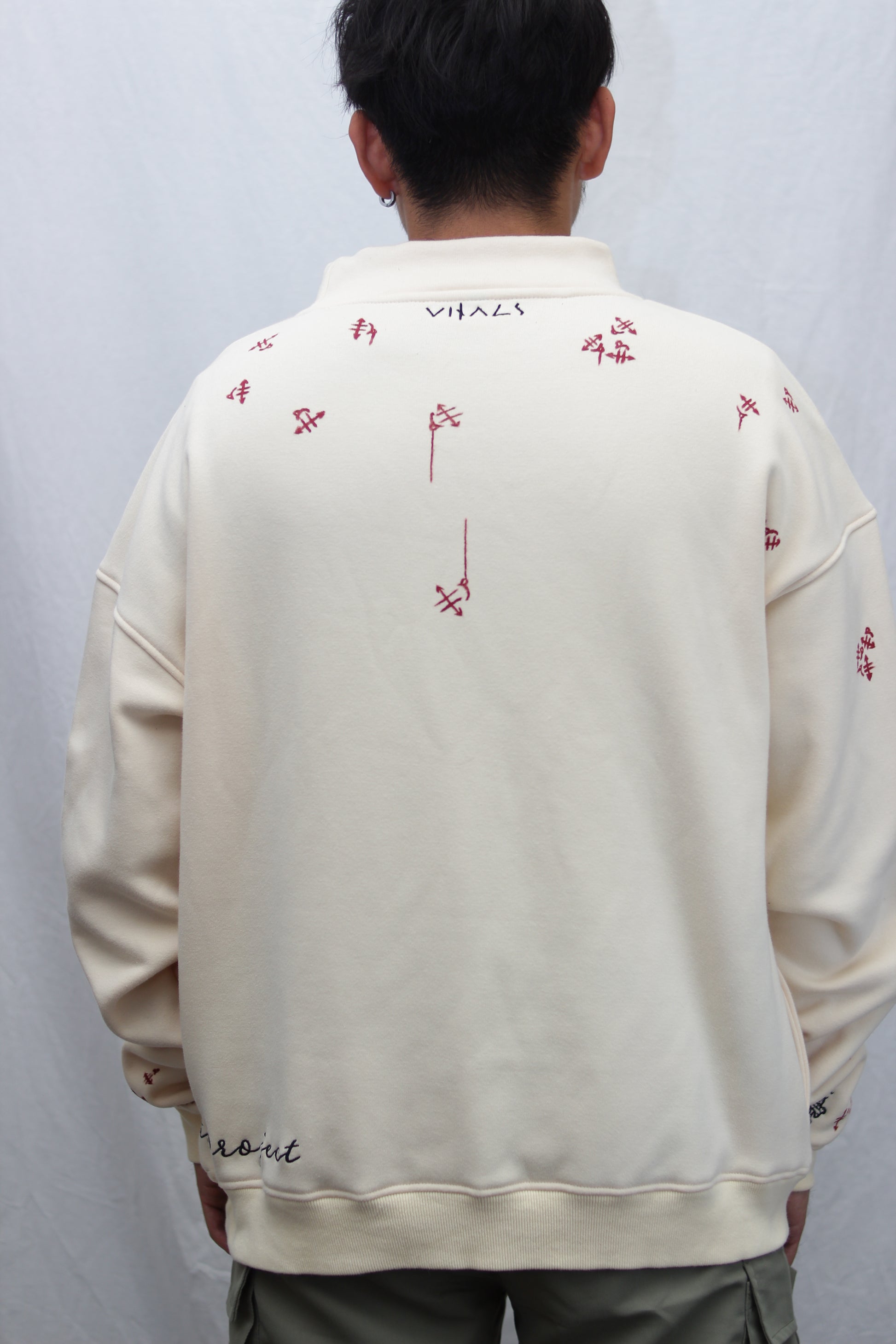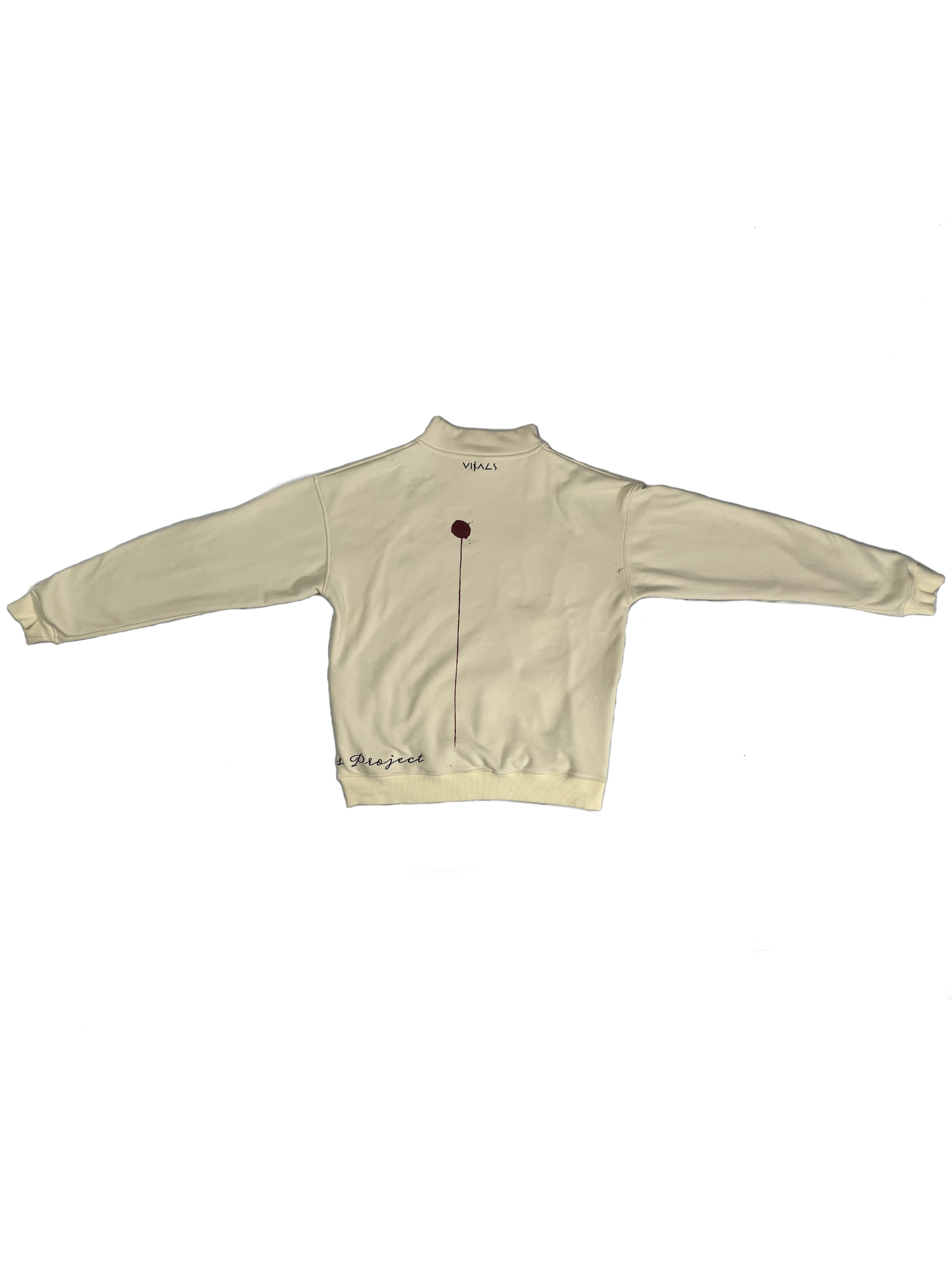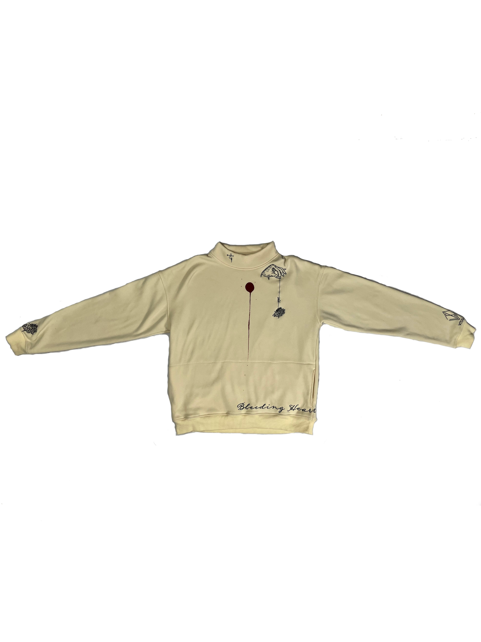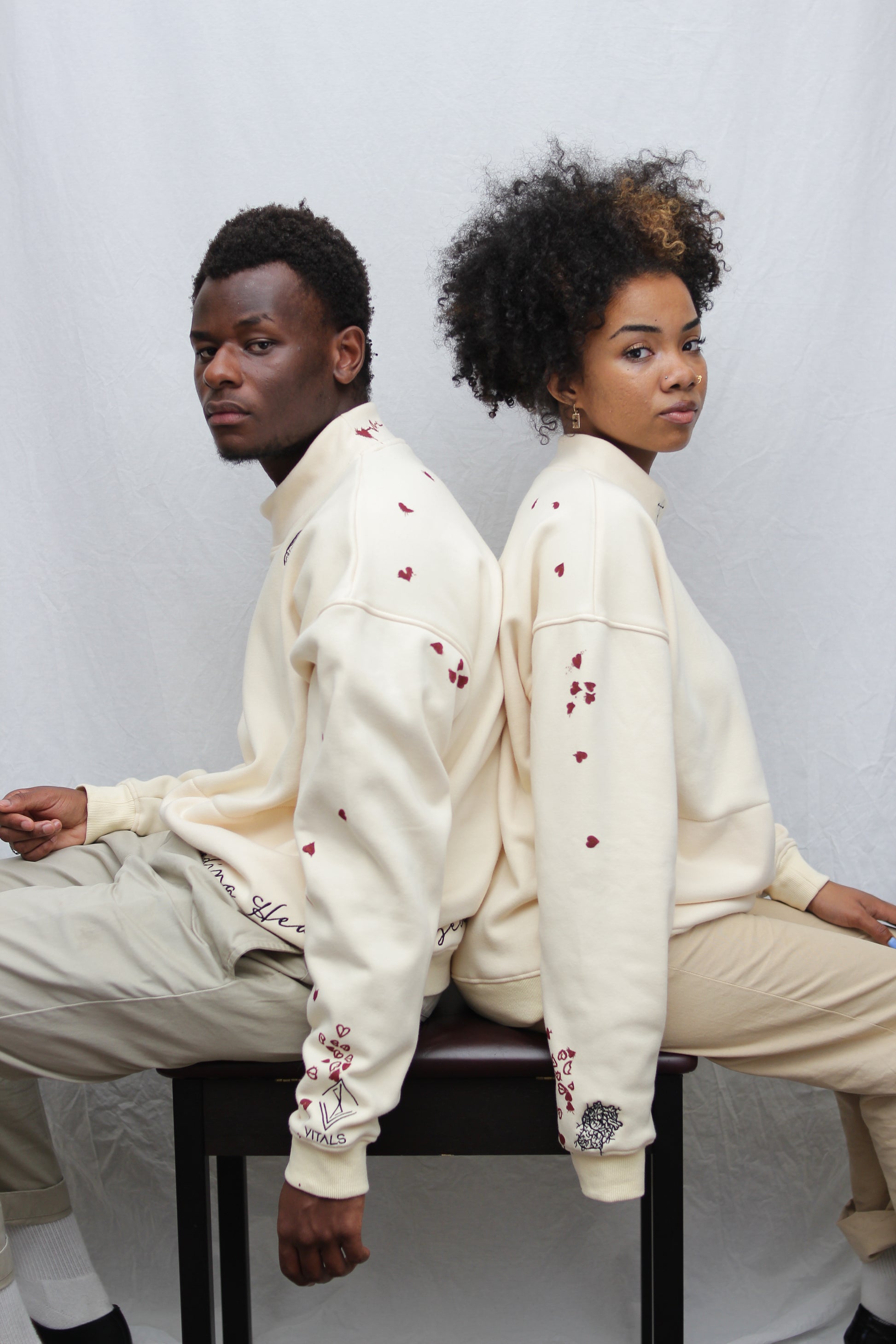 Introducing the Bleeding Hearts Mock Neck, a unique design that came to our designers in a dream. This piece represents the heart and core of the project. The hand pulling on the heartstring that forms the word "vitals" is embroidered onto the fabric in black, symbolizing the passion and dedication that we pour into our craft.