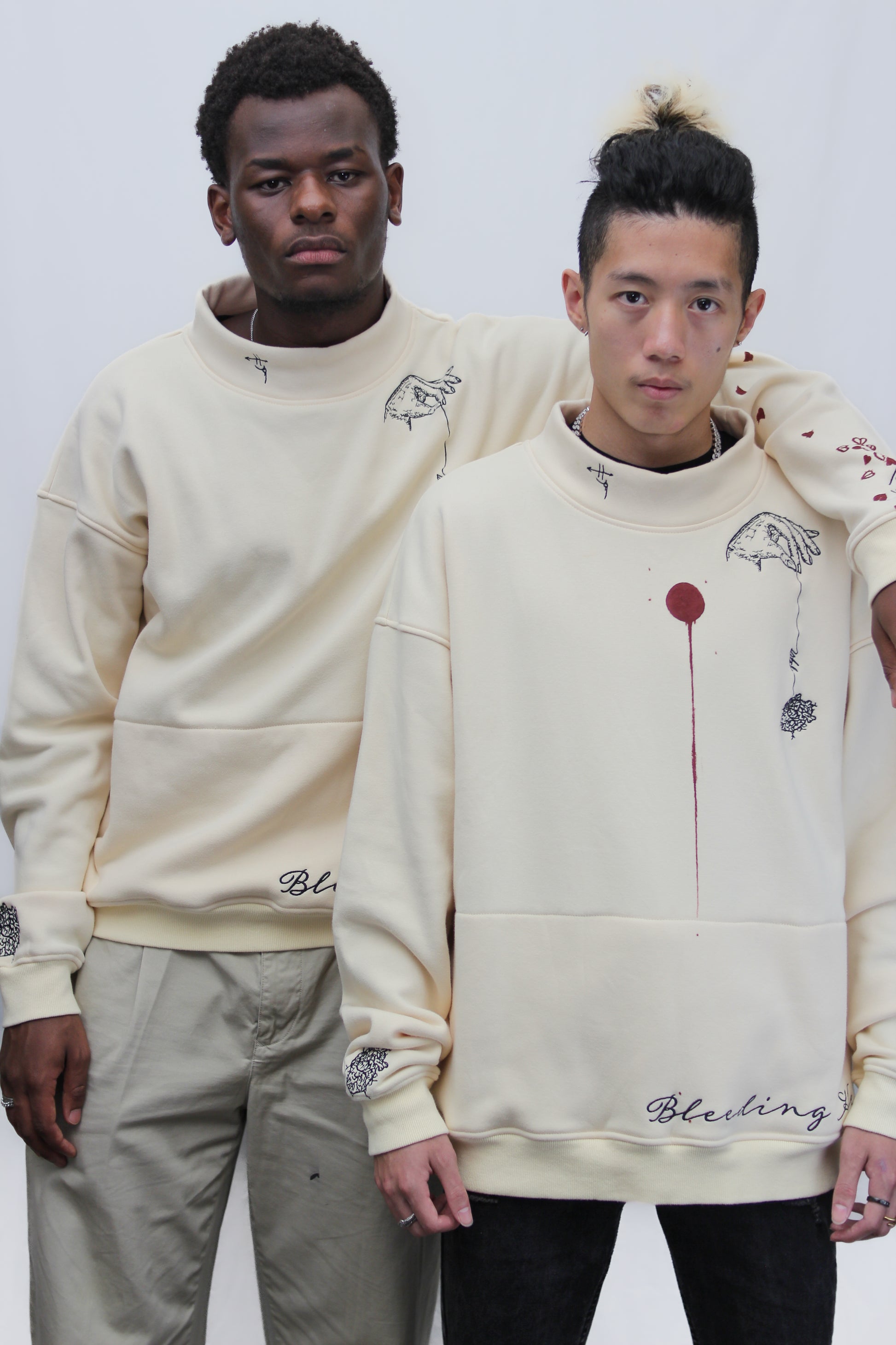 Each piece is unique, with a blood pattern hand-stained onto each piece, representing how each item has the blood of the creators at its core. This pattern makes each piece a one-of-a-kind piece, with the only repeating elements being the design and the heart stitched into the sleeve. The embroidered heart on the sleeve represents the importance of keeping your heart, what you love, or your passion close to you at all times.